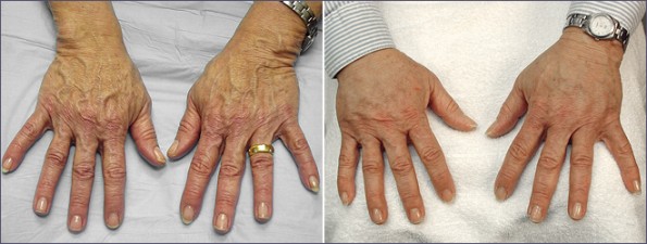 This 63 year old patient had recently undergone a blepharoplasty and facelift by Dr. Parker and wished to have her hands look as rejuvenated as her face. Fat was removed from her abdomen and meticulously injected into the dorsum of both hands. The patient recovered rapidly and was delighted with the more youthful appearance of her hands.