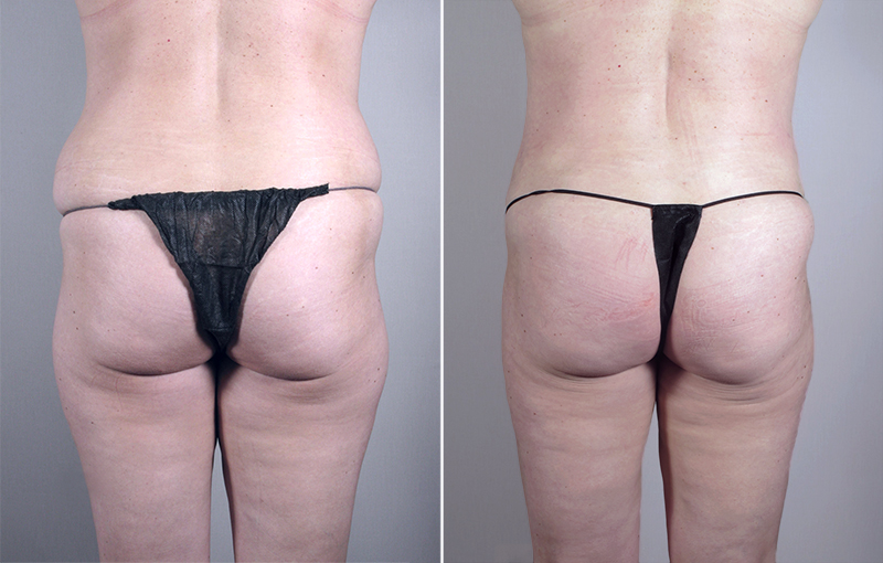 This 35 year old, referred to Dr. Parker by her dermatologist, requested help with fullness in her abdomen, hips and thighs. She is 5’8″ tall and weighs 170 pounds and has given birth to four children. Dr. Parker used VASER liposuction to improve her shape, removing fat from the following areas: hips (500 cc Rt, 525 cc Lt), abdomen (500 cc fat removed), inner (225 cc each side) and outer thighs (425 cc each side). The patient enjoyed a rapid recovery from surgery and is pleased with her improved contours.