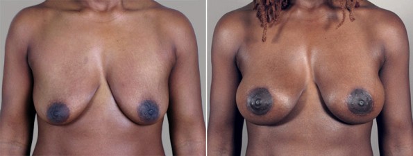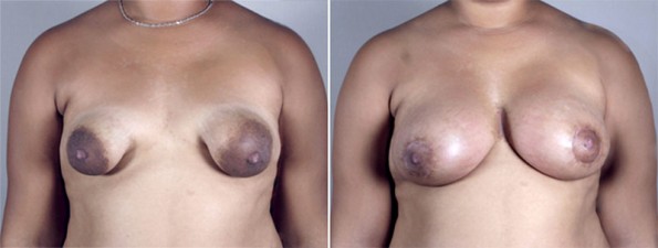 Before & after peri-areolar mastopexy with implants to correct moderate ptosis