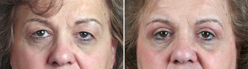 This 61 year old patient underwent an upper lid blepharoplasty removing asymmetric excess skin and herniated fat.