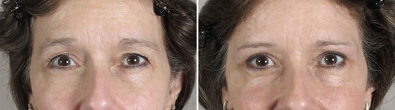 This 42 year old patient underwent an upper lid blepharoplasty, and at the same time, removal of her corrugator muscles.