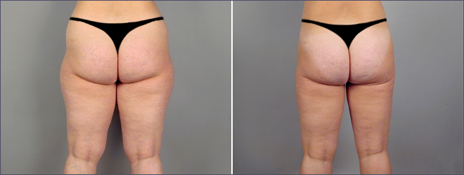This 37 year old was concerned about diet-and-exercise resistant fat deposits in her abdomen, hips, circumferential thighs, and knees. The patient is 5 feet tall and weighs 128 pounds. Dr. Parker performed SAFE liposuction of the above areas removing 4600 cc of fat. Postoperatively, note how everything appears thinner and in better proportion.