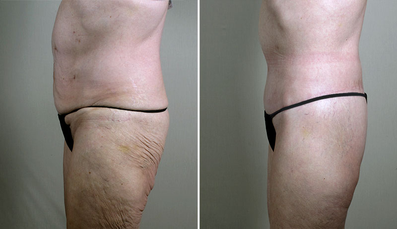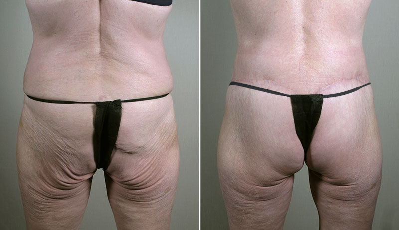This 63 year old patient asked Dr. Parker to improve the appearance caused by the lax soft tissues on her abdomen, buttocks and outer thighs. She had undergone gastric sleeve surgery one year ago and lost 65 pounds since. The patient is 5’3″ tall, weighs 122 pounds and says her weight is now stable. She had many weight swings from 120 to 180 pounds in the past. After examining the patient, Dr. Parker discussed options with her including a circumferential abdominoplasty with a body lift. The patient did not want tissue transferred to her buttocks to make them fuller. Dr. Parker performed this surgery several weeks later. The patient did very well in her recovery. She is very happy with her results and has received wonderful feedback about how good she looks from her husband as well as her friends.