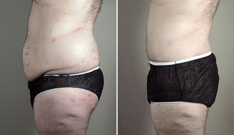 This 23 year old requested Dr. Parker improve the contour of his abdomen and flanks following bariatric surgery 4 years ago and subsequent 250 pound weight loss. His weight has been stable for some time now. The patient is 6’4″ tall and weighs 270 pounds. Dr. Parker performed a lipoabdominoplasty, liposuction of the patient’s flanks and a body lift. In doing so, he removed approximately 20 pounds of skin and fat. The patient is delighted with the markedly improved appearance of his torso.