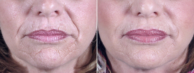 This 56 year old patient, referred by her friend to the Parker Center, expressed concern about facial aging. She requested non-surgical rejuvenation with fillers and Botox. The Doctor injected Botox into her glabella, forehead, crow’s feet, the tail of her eyebrows as well as upper and lower lips to soften these wrinkle lines. He then injected Juvederm Ultra Plus and Perlane into her nasolabial folds, marionette lines and chin, Restylane to her glabella and eyebrows. The patient is delighted with her non-surgical rejuvenation, receiving many compliments about her more youthful and rejuvenated appearance.