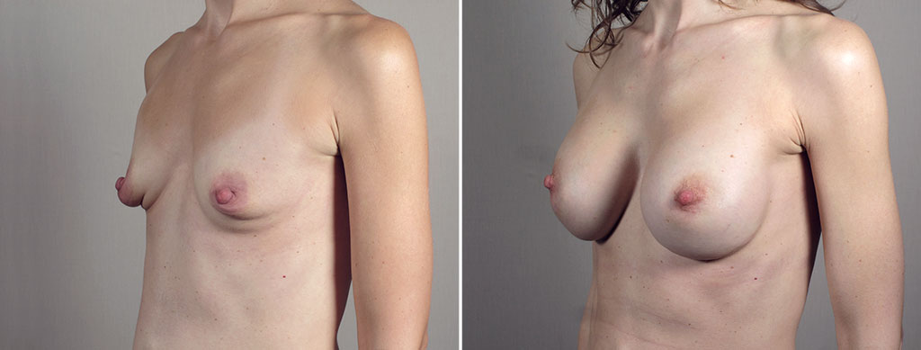 This 36 year old requested fuller breasts from Dr. Parker. She explained her breasts deflated after breastfeeding 4 children and she would like them restored. The patient is 5’4″ tall, weighs 115 pounds, and wears a 34 A cup bra. During her Sizing Sessions, the patient chose a 275 cc silicone implant for her larger right breast and 300 cc implant for her left side. During surgery, Dr. Parker created partial submuscular pockets through inframammary incisions and inserted these implants. The patient said she recovered quickly afterward. She loves the size and shape of her breasts as well as feeling much more self-confident.