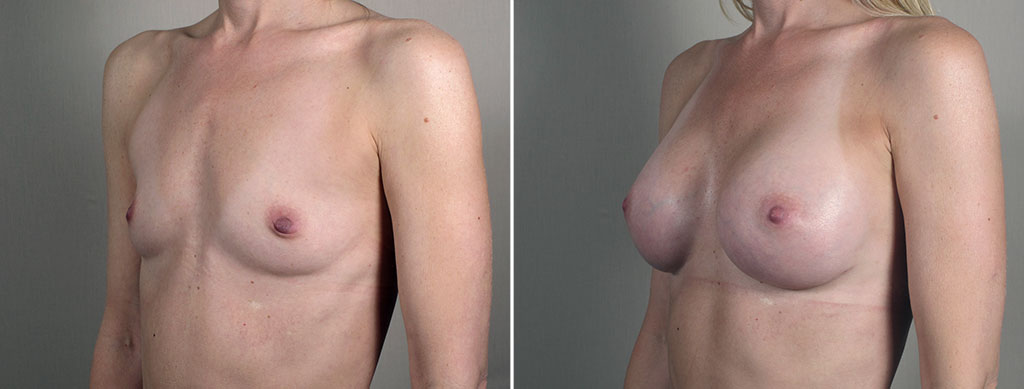 This 43 year old was referred to Dr. Parker by a coworker. The patient said her breasts have always been small but became even smaller after having had children. She would like to be fuller, but natural. The patient is 5’5″ tall, weighs 102 pounds and wears a 32 A cup bra, if that, she says. Dr. Parker discussed breast augmentation in detail with her before scheduling surgery. In her Sizing Session, the patient selected 350 cc silicone implants. During surgery, Dr. Parker inserted these implants into a partial submuscular pocket through inframammary incisions. The patient reported she enjoyed a quick recovery. She said she loves how she looks; she saw a new gynecologist recently who said they would not have known she had breast implants in place if she did not tell them.