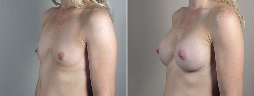 This 33 year old was referred to Dr. Parker by another patient. She said her breasts have always been smaller than she desires and would like them fuller too. The patient is 5’3″ tall, weighs 115 pounds, and wears a 34 A cup bra. Dr. Parker discussed breast augmentation in detail with the patient after examining her. In her Sizing Sessions, the patient selected 350 cc silicone implants. At surgery, Dr. Parker inserted these implants into a partial submuscular pocket through inframammary incisions. The patient was pleased with her quick recovery. She says she is very happy with her results. The patient loves the way she looks in and out of clothes. She recently bought some bathing suits and was thrilled.