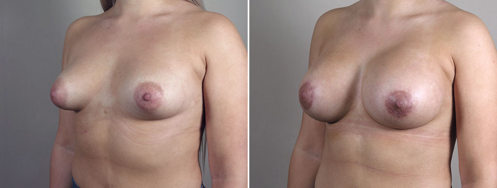 This 26 year old has been bothered by the appearance of her breasts since development. She told Dr. Parker that she wanted fuller breasts, smaller areolas, lower poles expanded, and the breasts more symmetric including the creases beneath her breasts. The patient is 5’3″ tall, weighs 145 pounds, and wears a 34 B cup. Dr. Parker explained that her breasts are known as “tuberous breasts”, meaning that they are constricted by lower pole fibrous bands causing the breast tissue and areola to herniate forward with high, tight, asymmetric inframammary folds. He said surgery could be performed to reduce the size of the areolas, release the constricting bands, lower the inframammary folds, and insert breast implants to provide better shape to the breasts. Implant size was decided during a pre-operative Sizing Session; the patient selected 375 cc silicone implants. Dr. Parker performed the procedure exactly as described to the patient. She enjoyed a quick recovery after surgery associated with very little pain. The patient loves the natural look and feel of her breasts as well as feeling much more self-confident.