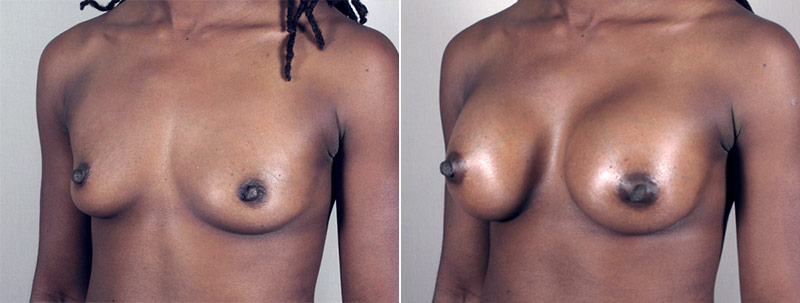 This 25 year old African American patient, referred by her sister to Dr. Parker, requested breast enlargement. She said she has always been smaller than she liked and became even smaller following childbirth. The patient is 5’4″ tall and weighs 127 pounds. During the patient’s Sizing Session, she selected saline implants, 300 cc for the right breast and 325 cc for the left. Dr. Parker inserted these implants through an infra-mammary incision into a partial subpectoral pocket. The patient recovered quickly and with little pain after surgery. She loves her breast size and shape. Additionally, she feels much more self-confident and is very happy she had the procedure done.