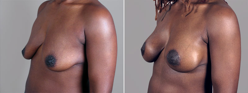 This 32 year old African American patient lost 60 pounds over several months with diet and exercise. She complained to Dr. Parker about her loss of breast volume and sagging of her breasts. The patient is 5’4″ tall and weighs 140 pounds. After reviewing all options with Dr. Parker, the patient elected to undergo breast augmentation along with a periareolar mastopexy. During her Sizing Session, the patient selected 325 cc and 300 cc saline implants, respectively, for the right and left sides. During surgery, Dr. Parker first inserted these implants into a partial submuscular location to restore breast volume. He then lifted the breasts to achieve a more youthful shape with the periareolar mastopexy. Liposuction of the armpit area, otherwise known as the tail of the breast, was performed as well to help shape the breast further. The patient enjoyed a smooth and quick recovery. She loves her improved breast size and shape. Her incisions are not perceptible.