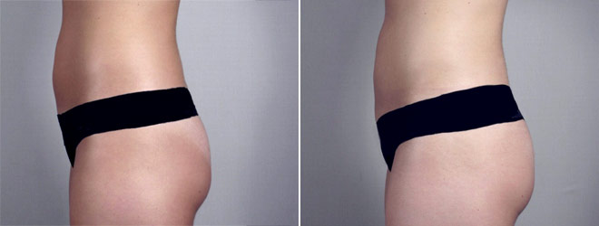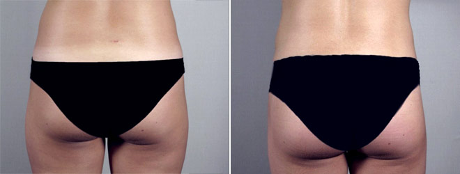 This 29 year old presented to Dr. Parker with concerns about her small breasts and fullness in her abdomen, hips, outer thighs and knees. The patient is 5’3″ tall and weighs 130 pounds. Dr. Parker inserted silicone gel implants through inframammary incisions, 225cc on the right side and 250cc on the left to create fuller, more symmetric breasts. Additionally, he removed fat from the following areas using the VASER liposuction system: abdomen–450cc, right hip–425cc, left hip–375cc, outer thighs–300cc each side and knees–100cc each side. The patient enjoyed a quick recovery. She is delighted with her much more shapely figure.