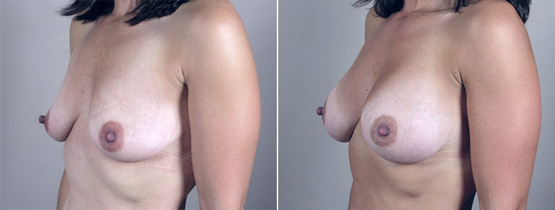 This 38 year old, previously underwent liposuction by Dr. Parker, returned now for breast enhancement. She was bothered by the loss of fullness in her breasts after childbirth and nursing. The patient is 5’1″ and weighs 114 pounds. In her Sizing Session, the patient selected 350 cc silicone implants be inserted. Dr. Parker inserted the implants into a partial submuscular position though a periareolar incision. The patient was astounded at how rapidly she returned to daily activities. She is delighted with her improved breast size and shape.