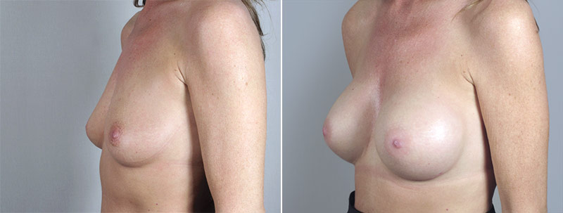 This 45 year old, referred to Dr. Parker by another patient, requested breast enhancement. Her breasts have always been smaller than she would like, but became even smaller after pregnancy. The patient is 5’5″ and weighs 112 pounds; she currently wears an A cup bra and would like to be a B cup, stressing that she doesn’t want anything “too drastic”. In her pre-operative Sizing Sessions, the patient decided upon 275 cc silicone implants to be inserted through infra mammary incisions. Dr. Parker complied with the patient’s wishes, inserting 275 cc silicone implants in each breast. Postoperatively, the patient experienced very little pain, bruising or swelling. She is very pleased with improved size and shape of her breasts as well as their natural and soft feel.