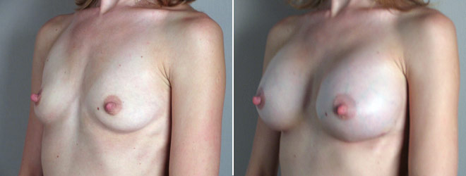 This 28-year-old complained that her small breasts became even smaller following the birth of her children. She currently wears an A cup, which she says is too big for her breasts. She is 5 feet 3 inches tall, weighs 103 pounds. In her preoperative sizing and shaping session, the patient requested 375 cc silicone implants. She and Dr. Parker agreed upon an inframammary incision with submuscular positioning due to the thinness of her tissues. She recovered quickly from her surgery and is thrilled with the size and shape of her breasts.