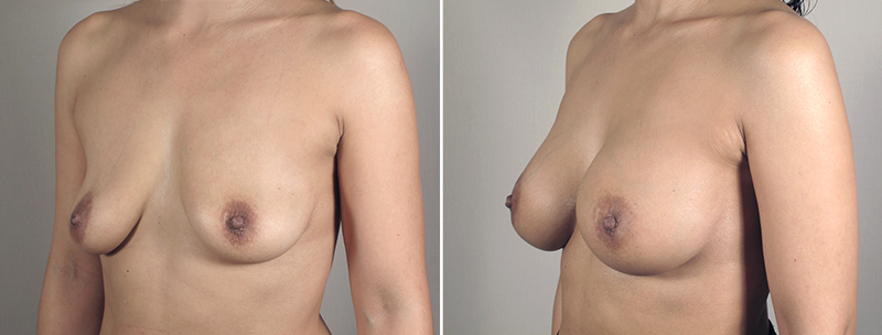 This 39 year old requested breast augmentation. Her breasts have always been smaller than she would like and most recently, they’ve sagged. She is 5’6″ and weighs 135 pounds. She currently wears a 34 B cup and would like to be a C cup. The patient chose silicone implants, 300 cc on the right and larger breast, 325 cc on the left side. The patient’s recovery was unremarkable. She is very happy with her fuller, better proportioned breasts.