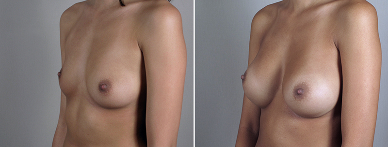 This 25 year old was referred for breast augmentation by her sister who had previously undergone breast augmentation by Dr. Parker. The patient is an A cup now and would like to be a full B cup. Her breasts have always been smaller than she would like. She is 5’4″ tall and weighs 100 pounds. During her Sizing Sessions the patient selected silicone implants, 350 cc on the right smaller breast, 300 cc the left side. Dr. Parker inserted these through inframammary incisions. The patient recovered quickly after surgery. She is thrilled with the fuller appearance and soft feel of her breasts.