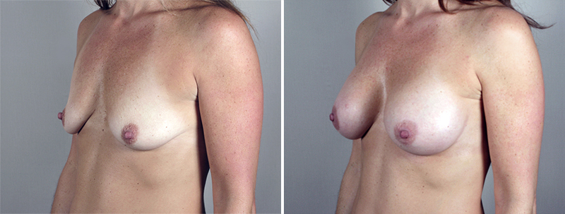 This 42 year old, referred to Dr. Parker by another patient, requested improvement in the appearance of her breasts which became smaller and sagged after childbirth and breast feeding. Currently a 34 B cup, she desires to be a C cup with fuller, perkier breasts. The patient is 5’4” tall and weighs 127 pounds. During her initial consultation, Dr. Parker pointed out the pre existing asymmetry of her breasts with the left somewhat larger and droopier than the right. The patient selected a 325 cc silicone implant on the right side and 300 cc on the left during her Sizing Sessions. Dr. Parker inserted these implants into a partial submucular position through inframammary incisions during surgery. The patient enjoyed a prompt, virtually painless recovery. She is very pleased with her fuller and perkier breasts.