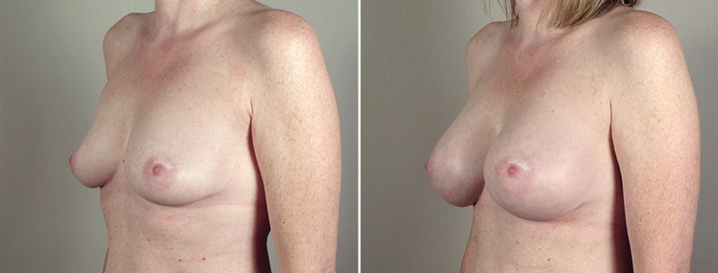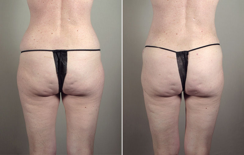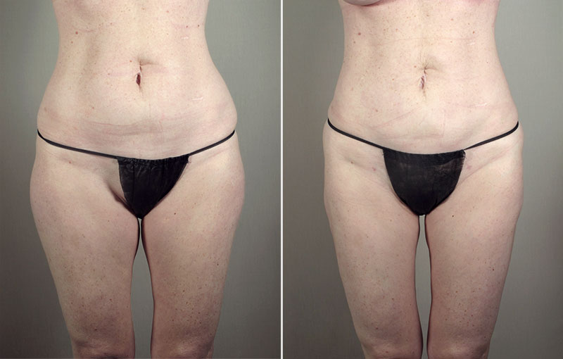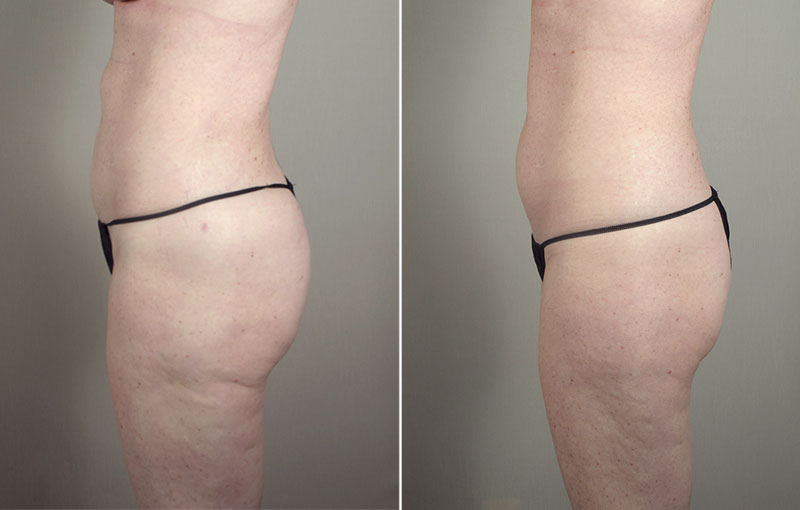 This 42 year old was referred to Dr. Parker by another patient. After giving birth to 3 children, the patient said she was bothered by her sagging breasts and buttocks. She wished to have her abdomen, hips and thighs made more shapely. The patient is 5’4″ tall and weighs 122 pounds. At surgery, Dr. Parker inserted differential sized silicone implants to optimize the pre-existing asymmetry in the patient’s breasts: 325 cc on the right side and 275 cc on the left. Using VASER liposuction, he removed 420 cc of fat from the abdomen, 460 cc of fat from each hip, 120 cc of fat from each inner thigh and 300 cc of fat from each outer thigh. Dr. Parker then purified the fat and injected 420 cc of fat into each buttock. The patient had little pain after surgery and recovered quickly. She is very happy with her fuller breasts as well as the improved contour of her abdomen, hips, thighs and buttocks.