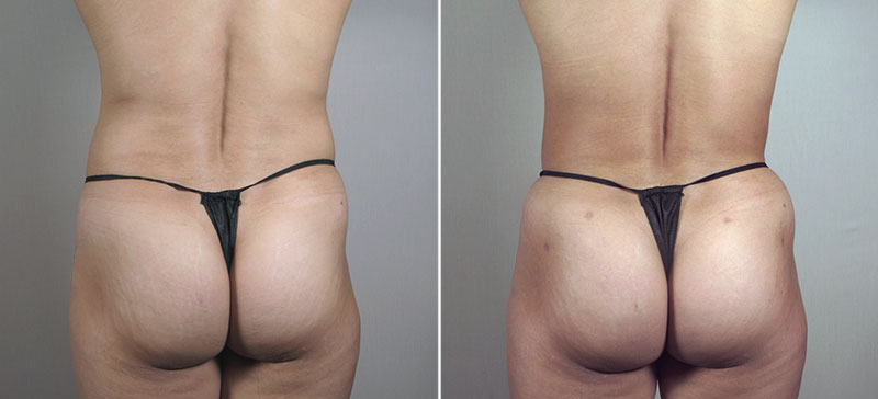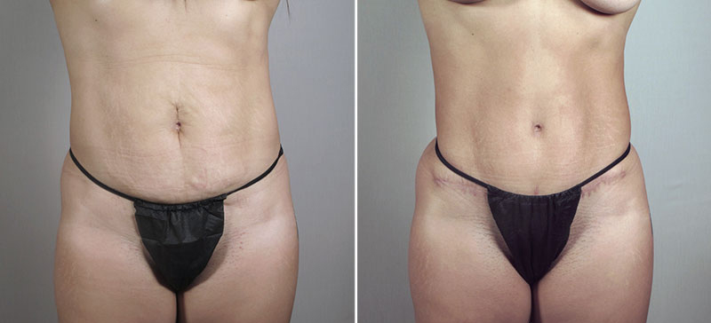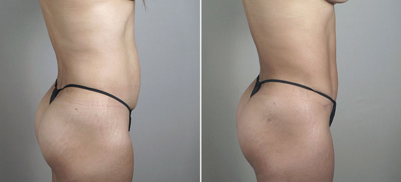 This 39 year old nurse gave birth to 2 children and never bounced back from the second baby 7 years ago. She complained to Dr. Parker about the “kangaroo pouch” on her abdomen, fullness in her hips and her small breasts. She is a 36 A cup and said most bras don’t fit well at all. The patient is 4’11” and weighs 123 pounds. Dr. Parker performed a breast augmentation, inserting 325 cc silicone implants into a partial sub muscular position through inframammary incisions, a lipoabdominoplasty, and SAFE liposuction of the hips, removing 350 cc of fat from each side. The patient recovered very quickly afterwards. She is absolutely thrilled with the improved appearance of her breasts, abdomen and hips. This has given her a renewed sense of enhanced body image and self esteem.