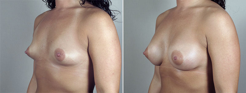 This 28 year old was bothered by her very small breasts, “barely an A cup”, she said. The patient wished to be a full B/small C cup. She is 5’4″ tall and weighs 140 pounds. Dr. Parker inserted 300 cc silicone implants into a partial submuscular location through inframammary incisions. The patient’s recovery was quick and unremarkable. She is delighted with her fuller, more uplifted breasts.