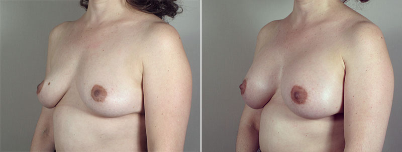 This 45 year old requested breast augmentation by Dr. Parker to restore volume she lost from her breasts after childbirth. She is currently a small B cup and would like to be full B, small C cup. The patient is 5’3″ tall and weighs 145 pounds. During her Sizing Sessions, the patient selected 350 cc silicone implants. Dr. Parker subsequently inserted these into partial submuscular pockets using inframammary incisions. The patient healed quickly. She loves her restored and improved breast shape.