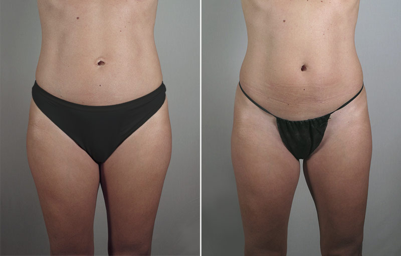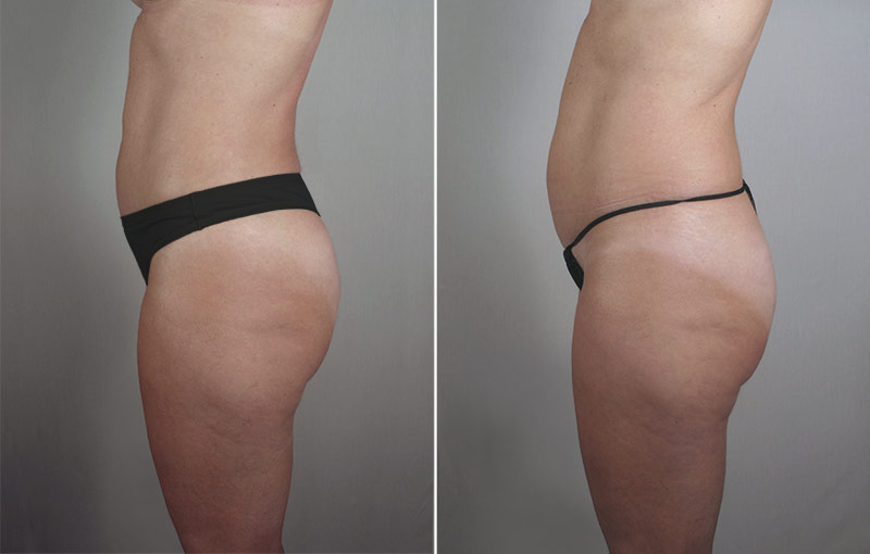 This 46 year old was referred to Dr. Parker by several other Parker Center patients. She came in requesting fuller breasts, along with a reduction in the fullness of her abdomen, hips, and the “tail” of her breasts (the extension of the tissue of the breast into the underarm). The patient is an A cup and wished to be a full B cup. She selected her implant sizes during her Sizing Sessions. The patient is 5’2″ tall and weighs 116 pounds; she says her weight is stable. Based on her preexisting breast asymmetry, Dr. Parker inserted different sized silicone implants: 250 cc in the right and larger breast, 275 cc in the left breast. In performing SAFE liposuction during the same operation, he removed the following amounts of fat: abdomen–375 cc, hips–475 cc each side, and tail of breast–25 cc each side. The patient’s recovery was unremarkable. She is very happy with the results of her surgery.