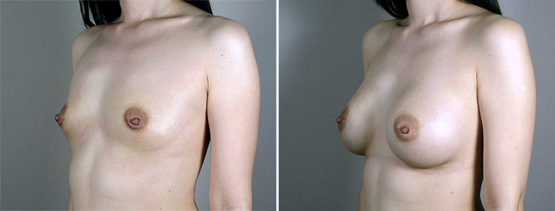 This 32 year old Asian patient was referred to Dr. Parker by another patient. She came in requesting more volume in her breasts which she said disappeared after breastfeeding her two sons. The patient is 5′ 9″, weighs 135 pounds and wears a 34 A cup bra. During her Sizing and Shaping sessions, she decided upon 375 cc silicone implants. At surgery Dr. Parker used inframammary incisions to insert these into a dual-plane location. The patient bounced back quickly afterwards with no bruising, only a mild amount of swelling, and no pain. She loves the restored fullness of her breasts as well as their natural look and feel.