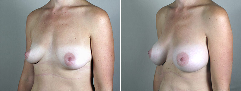 This 33 year old was referred to Dr. Parker by one of his other breast augmentation patients. She came in complaining that her breasts looked deflated after breastfeeding 2 children. The patient is 5’10” tall, weighs 150 pounds and wears a 38 B cup. During the patient’s Sizing and Shaping sessions, she chose a 400 cc silicone implant on her right and smaller breast and a 375 cc implant on her left side. During surgery, Dr. Parker inserted these implants into a dual-plane location using short, inframammary incisions. She said her recovery was a “non event”. She loves the look and soft feel of her “new breasts”.