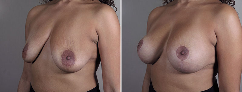 This 45 year old patient had 450 cc saline implants inserted in a partial submuscular position by another surgeon in 2001. She noticed a gradual deflation of her right breast implant over the past 2 years. The patient asked Dr. Parker to exchange her implants for smaller silicone implants and lift her nipples using a periareolar mastopexy, an incision only around the areola. She and her husband did not want the vertical scarring associated with a vertical mastopexy, otherwise known as a “lollipop” lift. Dr. Parker met with the patient and her husband on three separate occasions before surgery to discuss these options in detail. He explained that based on his experience, she would obtain more youthful, perkier breasts lifted higher on her chest with smaller implants and a lollipop lift. A periareolar lift with an incision only around the areola would not be able to deliver this same youthful, perkier, lifted breast. The patient and her husband agreed. At surgery, Dr. Parker removed her existing 450 cc saline implants and replaced them with 300 cc silicone implants, then performed the lollipop lift. The patient recovered nicely with little pain. She loves the markedly improved appearance of her breasts.