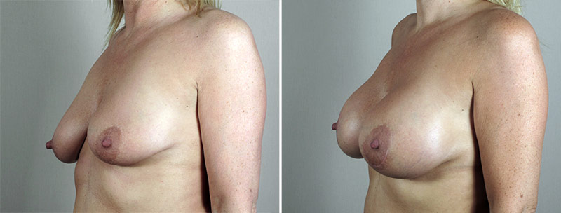 This 43 year old existing patient of Dr. Parker’s returned requesting breast augmentation. She said that after breastfeeding 2 children her breasts lost volume and sagged. She would like to have them made fuller again. The patient is 5′ 2″ tall, and came in weighing 121 pounds, wearing a 34 B cup. She wanted to be a C/D cup. During the patient’s consultation, Dr. Parker pointed out the pre-existing asymmetry of her breasts including the discrepancy between the height of the nipple-areolar complexes. They discussed breast augmentation along with a peri-areolar mastopexy, or lift, on the right side to improve her symmetry. During her Sizing and Shaping sessions, she selected silicone implants, 325 cc for the larger right breast and 400 cc for the smaller left breast. At surgery, Dr. Parker inserted these implants into a dual-plane location through peri-areolar incisions. He performed a peri-areolar breast lift on the right side. The patient was delighted with her quick recovery afterwards. She loves her fuller, more youthful, and symmetrical breasts.