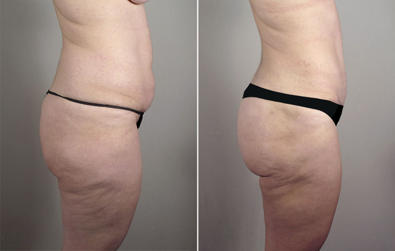 This 35 year old presented to Dr. Parker with concerns about her breasts, abdomen and buttocks. Following the birth of her children, she complained that her breasts now sagged, her abdomen had a bulge along with sagging skin and her buttocks had deflated. The patient is 5’3″ tall and weighs 145 pounds. She wears a D cup bra. Dr. Parker discussed treatment options with the patient, at length, during her initial consultation. In discussing her breasts, the patient decided she wanted a lollipop lift but did not want implants inserted. Dr. Parker discussed transferring breast tissue from the lower aspect of her breast to fill out upper aspect, which was deflated. He called this “auto-augmentation”, meaning he would use her own or autogenous breast tissue, as if it were an implant to fill out the upper breast. The patient also decided upon a lipoabdominoplasty, SAFE liposuction of her hips and fat injections to her buttocks. Several weeks later, Dr. Parker performed a lollipop lift with auto-augmentation, lipoabdominoplasty, SAFE liposuction of the hips (removing 500 cc of fat from each hip) and injected 550 cc of fat into each buttock. The patient enjoyed a smooth recovery. She loves her uplifted, fuller breasts and the improved contour of her abdomen, hips and buttocks.
