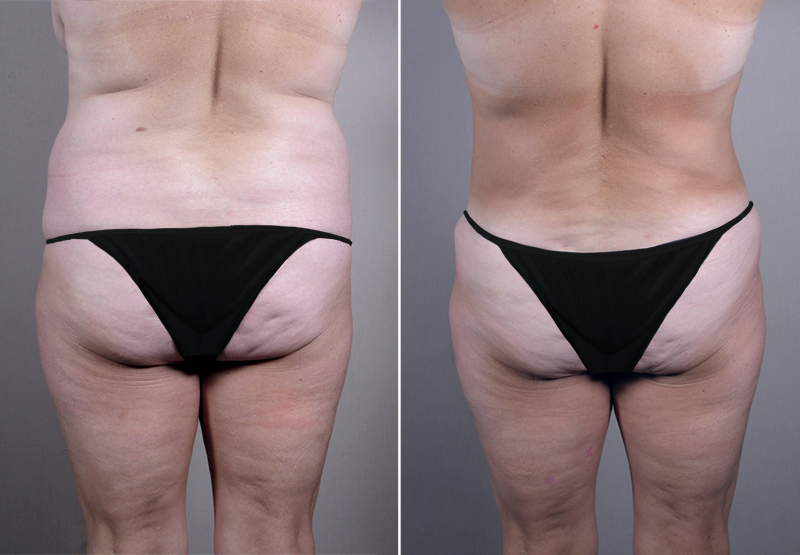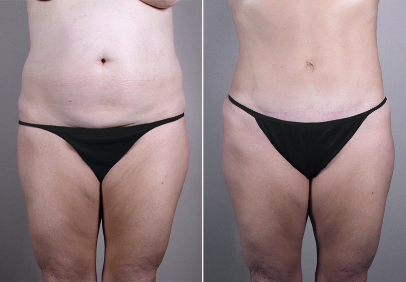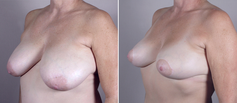 This 57 year old requested that Dr. Parker rejuvenate her large, sagging breasts and the fullness of her abdomen. She is an avid runner and both the hanging skin on her abdomen and pendulous DD breasts adversely affect her ability to do this as she would like. The patient had given birth 18 years earlier via a C section. She is 5’1″ and weighs 138 pounds. During the patient’s initial consultation with Dr. Parker, he recommended a vertical breast reduction and lift along with a lipoabdominoplasty and SAFE liposuction of her hips. At surgery, Dr. Parker removed 95 grams of breast tissue from the right side and 175 grams of tissue from the larger left side, then lifted them into a more youthful position with a “lollipop” incision. He removed 725 cc of fat from each of the patient’s hips with SAFE liposuction. He removed 825 cc of fat from the abdomen with SAFE liposuction as part of the lipoabdominoplasty procedure, then tightened the underlying rectus muscles and removed the excess skin. The patient recovered quickly, which surprised her given the amount of surgery she had performed at one operation. She is delighted with her results. Not only does she look good, but she is now able to wear form fitting tops and the clothing styles she likes. Seven months after surgery, she wore a bikini on family vacation–the first time she had done this since age 18. The patient is able to run more freely and feels very good about herself. Her only regret–”I wish I had done the surgery sooner”.