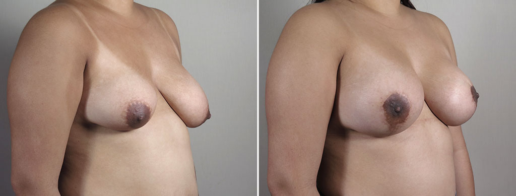 This 29 year old asked Dr. Parker to improve upon her breast asymmetry which has been present since her breasts developed. This asymmetry has not changed with weight gain, loss, or pregnancy. She would like her right breast fuller and uplifted, her left breast to match as closely as possible. The patient is 5’6″ tall, weighs 172 pounds, is a 36 B cup on the right side, and D cup on the left. Dr. Parker discussed options with the patient explaining her procedure was challenging and perfect symmetry unlikely. They agreed upon and he subsequently performed the following procedure: Dr. Parker inserted a 350 cc silicone implant in the right breast and performed a circumvertical mastopexy or breast lift. On the left side, he first removed 120 grams of tissue from the lower aspect of the breast, next inserted sizer implants, and even though the patient was under general anesthesia, sat the patient upright on the OR table. As he exchanged various sizer implants, Dr. Parker found a 250 cc silicone implant provided the closest match to the right side; with this knowledge, he then inserted a 250 cc permanent silicone implant on this side. Lastly, Dr. Parker performed a lollipop lift, or vertical mastopexy on the left breast to lift and match the right breast as closely as possible. The patient recovered quickly from the procedure. She is very happy with the markedly improved symmetry of her now fuller and uplifted breasts. The patient feels much more self-confident and is so happy to be able to show some cleavage that she could not do previously.