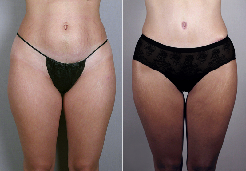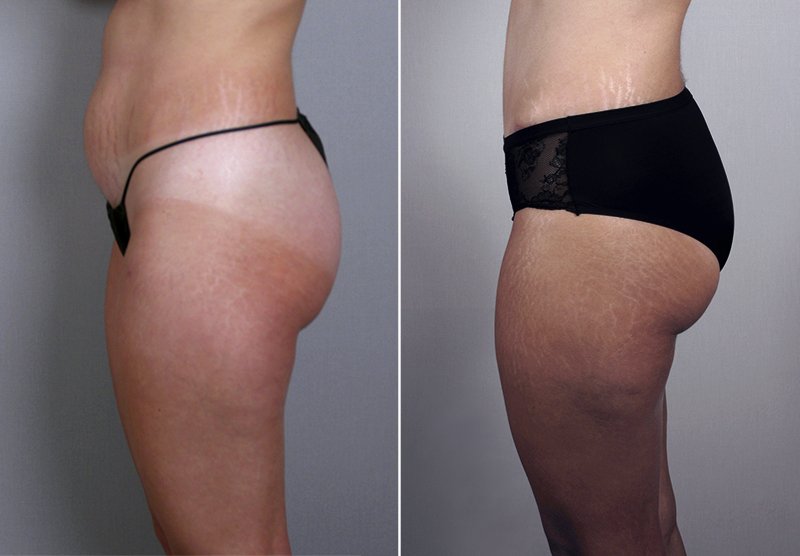 This 29 year old, whom Dr. Parker had operated several years ago for rhinoplasty, presented with several concerns. She had undergone the insertion of saline breast implants several years ago with another plastic surgeon. She feels they are too large, too heavy and sag. Additionally, she is bothered by the fullness of her lower abdomen and irregular c-section scar. Finally, she is concerned about the fullness in her outer thighs, knees and desires more fullness in her buttocks. The patient is 5′1″ and weighs 129 pounds. At surgery, Dr. Parker removed the patient’s 400cc saline implants, replacing these with 325cc implants. In addition, Dr. Parker performed a vertical mastopexy to lift the patient’s breasts higher on her chest. Additionally, Dr. Parker performed a lipoabdominoplasty along with SAFE liposuction of the lateral thighs (350cc fat removed from each side) and knees (75cc of fat removed from each side). He also injected 300cc of fat into each buttock to lift them and create more fullness. The patient recovered somewhat more slowly than most patients, with a little more pain (5-6 on a scale of 1-10). Following her recovery, the patient is now wearing a size 2 dress from a size 4 before surgery. She is delighted with her attractive figure.