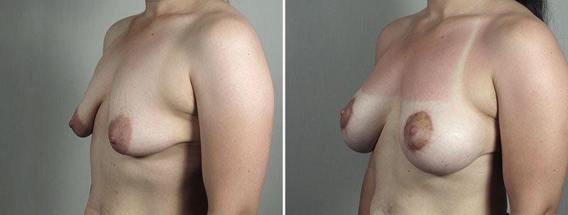 This 36 year old requested that Dr. Parker improve the appearance of her breasts after breastfeeding two children. She reported that her breasts sagged and lost their volume following her pregnancy. Accordingly, she would like her breasts to be fuller and uplifted. The patient is 5′, weighs 118 pounds and wears a 34 B cup bra. Dr. Parker explained that she also has tuberous breasts, and that it is very common to have lost volume and sagging following pregnancy and breastfeeding. Using periareolar incisions, Dr. Parker first released the constricting tissues in the lower portion of the breasts to correct her tubular breasts. He then lifted the areolas into a better position with periareolar mastopexies. Lastly, to increase her breast size, he inserted 325 cc silicone implants into a partial submuscular or dual plane position. The patient recovered quickly after surgery and loves the fullness and markedly improved appearance of her breasts.