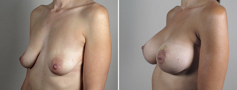 This 39 year old asked Dr. Parker to improve the appearance of her breasts. After having had 2 children, her breasts went from a size DD to a size 34 B cup, and became deflated and saggy, even though she had not breastfed her infants. She asked Dr. Parker to make her breasts fuller and lift them to a more youthful position. She is 5′ 8″ and weighs 120 pounds. Dr. Parker performed an augmentation mastopexy, or lollipop lift. In order to improve upon the patient’s pre-existing asymmetry, he inserted a 350 cc silicone implant in the right breast and a 375 cc implant in her smaller left breast. He then lifted the breasts higher on the patient’s chest wall with a lollipop lift. The patient recovered quickly and is absolutely thrilled with her fuller, uplifted breasts.