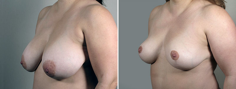 This 44 year old requested breast reduction surgery from Dr Parker. After having had 4 children, youngest 7 years old, her breasts increased in size and sagged. She asked to have her breasts made smaller (ie, C cup) and uplifted. The patient is 5’3″ tall, weighs 163 pounds and wears a 38G bra. Dr Parker performed a breast reduction along with a lollipop lift, or vertical mastopexy, removing 465 grams of tissue from the right breast and 435 grams of tissue from the left. The patient said her recovery was fine. She loves her C cup breasts with improved size and shape.