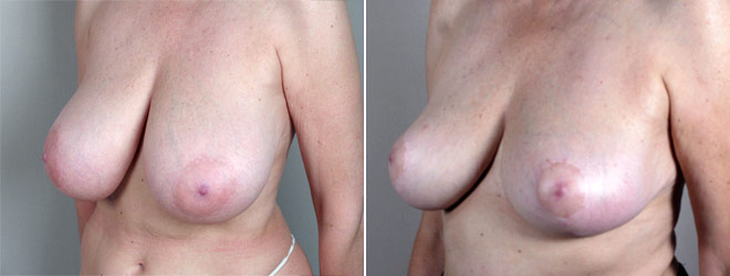 This 54 year old, referred to Dr. Parker by another patient, requested a reduction in the size of her breasts. She said she is a G cup. She is bothered by neck and back pain as well as shoulder strap furrows. Additionally her large breast size prevents her from exercising. The patient is 5’4″ tall and weighs 118 pounds. During a central pedicle breast reduction, Dr. Parker removed 555 grams of tissue from the right breast and 515 grams from the left to adjust for her pre-existing asymmetry. Following her recovery from surgery, the patient said she was very happy with the improved size and shape of her breasts. Her pre-operative symptoms have resolved, clothes fit much better and she is now able to exercise more comfortably.