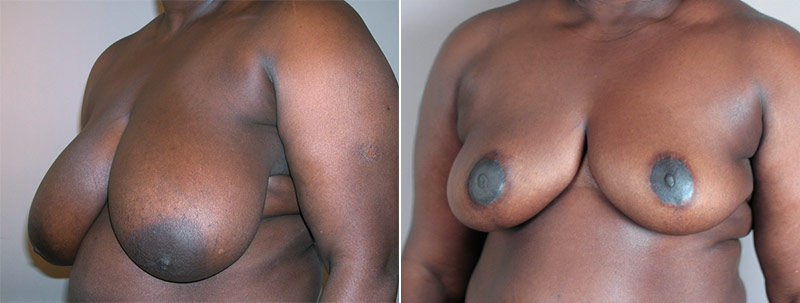 This 37 year old African American patient, referred to Dr. Parker by her gynecologist, was bothered by the size of her very large breasts. She wore a DD cup bra and requested reduction to a C cup. She is 5′6″ tall and weighs 210 lbs. Attempts at weight loss were unsuccessful. Dr. Parker performed a central pedicle breast reduction, removing 1192 gms from the right side and 1218 gms from the left. The patient healed quickly and well. She was very pleased with the postoperative appearance of her breasts and was motivated to begin an aggressive weight loss program.