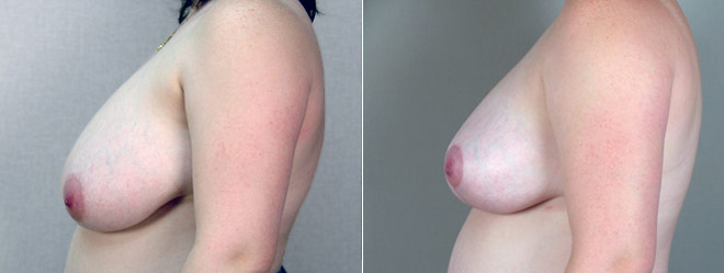 This 29 year old, referred to Dr. Parker by a friend, requested relief from large, hanging breasts which caused her shoulder strap irritation and rubbing underneath her breasts. She currently wears a 38D and would like to be a C cup. She is 5 feet 2 inches tall and weighs 152 pounds. A vertical breast reduction removed 270 grams from the right breast and 210 from the left. After surgery, the patient was able to wear a C cup bra in addition to her bothersome symptoms resolving.