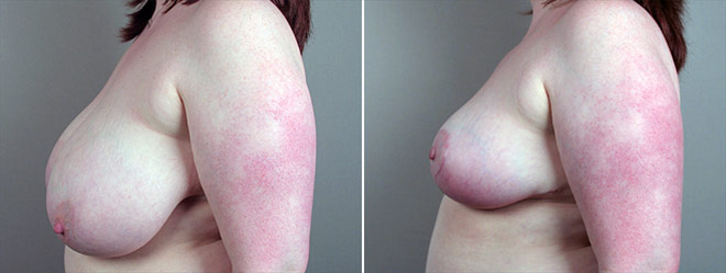This 33-year-old patient was referred by her gynecologist to Dr. Parker for breast reduction surgery. The patient presented as a double D cup and wished to be C cup in size. She is 5′4″ tall and weighs 175 pounds. Attempts at weight loss have been unsuccessful. Dr. Parker performed a central pedicle breast reduction removing 630 gm of tissue from the right breast and 650 gm from the left. Following surgery, the patient was happy with the improved size, shape and uplifted appearance of her breasts. Her preoperative symptoms of neck pain and back pain were resolved as well.