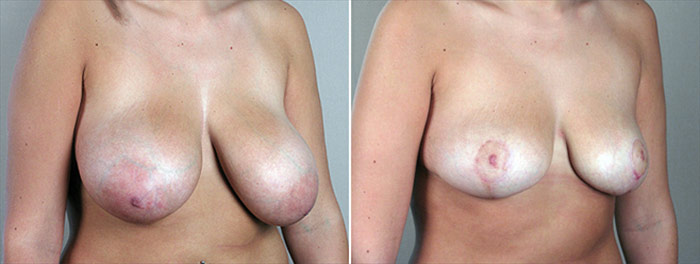 This 20-year-old patient complained of her large breasts causing neck and back pain. She wore a 36 double D bra and wished to be a C cup. The patient is 5′10′ and weighs 162 pounds. A central pedicle breast reduction was performed by Dr. Parker removing 490 gm from the left breast and 330 gm from the right breast. Postoperatively, the patient was pleased by the improved appearance of her breasts and disappearance of all preoperative symptoms.