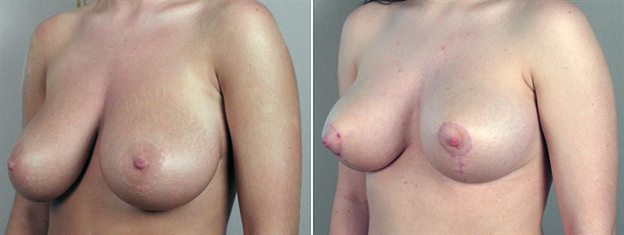 This 18-year-old was referred by her pediatrician to Dr. Parker for treatment of her large breasts. She currently wears a D-cup bra and has some neck and lower back pain. The patient is 5′5″ tall and weight is 125 pounds. Dr. Parker performed a vertical reduction mammoplasty removing 225 g of tissue from the right breast and 245 g from the left. Postoperatively, the patient recovered quickly from her surgery and is pleased with the improved size and shape of her breasts.