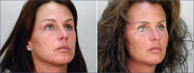 This 35 year old had sustained blunt trauma to her left eye and fractured her cheekbone several years earlier in addition to aging prematurely. Dr. Parker performed an upper and lower lid blepharoplasty. This included repairing the post-traumatic droopiness of the left upper eyelid as well as removing redundant skin and fat from both upper and lower lids to rejuvenate them. Different sized cheek implants were inserted to improve the appearance of both cheeks and correct for the broken left cheekbone the patient had sustained. Postoperatively, the patient and her family were delighted with the natural, but dramatic rejuvenation which had been achieved.
