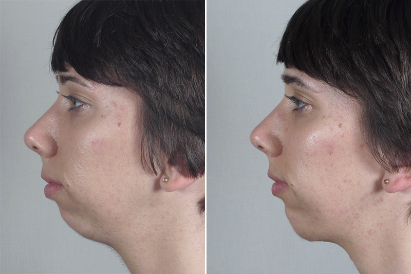 This 20 year old, referred by another patient to Dr. Parker, was bothered by her recessed chin. She said it had developed that way without any history of trauma. The patient asked Dr. Parker to make it look more normal with a more defined profile using a chin implant. She had briefly considered orthognathic surgery, to advance the chin bone forward, at one point in time but did not want a procedure that involved. Using a small incision just beneath the chin, Dr. Parker inserted a #4(large) extended anatomic chin implant to build out the patient’s chin. The patient experienced no pain postoperatively. Swelling and bruising resolved in short order. She is very pleased with the appearance of her more normal appearing chin and improved facial balance.