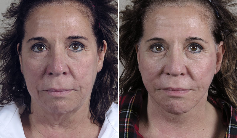 9 years ago, this 54 year old was referred to Dr. Parker by another patient requesting improvement in the appearance of aging eyes. She was concerned about her low brows, excess upper eyelid skin, and bags under her eyes. Dr. Parker discussed all options with her at that initial consultation and they arrived at the following plan: upper lid blepharoplasty with corrugator resection and internal brow-pexy to remove excess upper eyelid skin and rejuvenate her brows. In addition, a lower lid blepharoplasty was performed to remove the herniated fat from her lower lids as well as her lax skin. The patient recovered nicely following her surgery. The first photo set in the series shows how well her eye results have held up over the last nine years.
