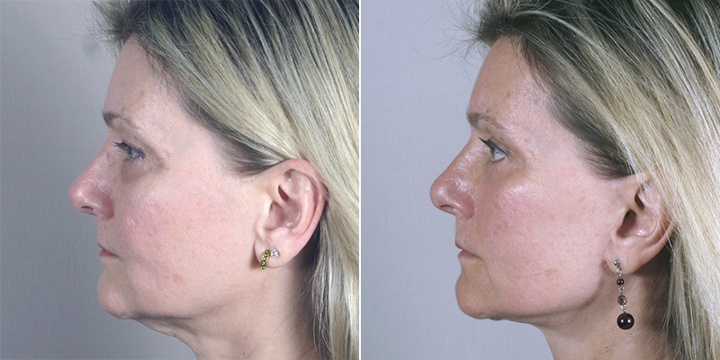 This 52 year old, referred by another patient, requested facial rejuvenation. She was bothered by drooping skin on her face from her eyes down; she also noticed swelling of her left cheekbone area called “malar edema”. She had undergone an upper and lower lid blepharoplasty by another surgeon 10 years prior. Dr. Parker reviewed options with the patient during her initial consultation. They agreed on the following operative plan: a conservative upper lid blepharoplasty along with a brow pexy, a lower lid blepharoplasty with translocation of fat to the nasojugal grooves, removal of excess skin, tightening of the lax obicularis oculi muscle and a lateral canthopexy. A biplanar facelift was planned to address the concerns about face and neck. This series of procedures was carried out during one operative session. The patient’s recovery was accompanied by more swelling than we usually see. The patient is very pleased with the rejuvenated appearance of her face and eyes along with the resolution of her left malar edema.