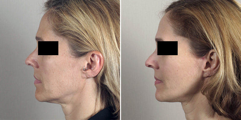 This 47 year old had chosen to have a lower lid blepharoplasty with Dr. Parker 8 years earlier and was very happy with her results. She recently returned to Dr. Parker asking if he could also help her treat laxity she was seeing in her mid and lower face. She felt her face was dropping and that her jowls had become more prominent. Dr. Parker discussed options with the patient, then subsequently performed a mini short scar face lift along with fat injections to the face. The patient sailed through her procedure and recovery very well. She is extremely happy with the natural but more youthful look she has obtained. Note how her cheek bones are fuller and higher, her jowls are gone, and her jawline and neck have cleaner lines. In addition, her skin looks much healthier. We believe this is due to the injections of fat and stem cells which has been shown to improve the health and appearance of the skin.