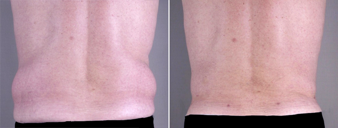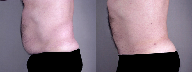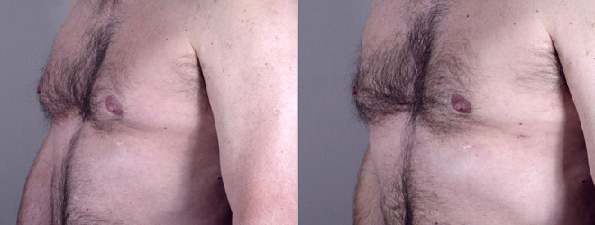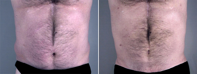 This 62 year old, referred by another patient, requested body contouring to his breasts, abdomen and flanks. He is 6′ tall and weighs 210 pounds. Dr. Parker performed VASER liposuction to the above areas. He removed the following amounts of fat: right breast–225cc, left breast–175cc, abdomen–725cc, right flank–700cc, left flank–700cc. The patient experienced very little pain and recovered rapidly. He loves his improved physique and has returned to the gym, aggressively working out several times a week. He has lost 12 pounds since resuming these workouts.